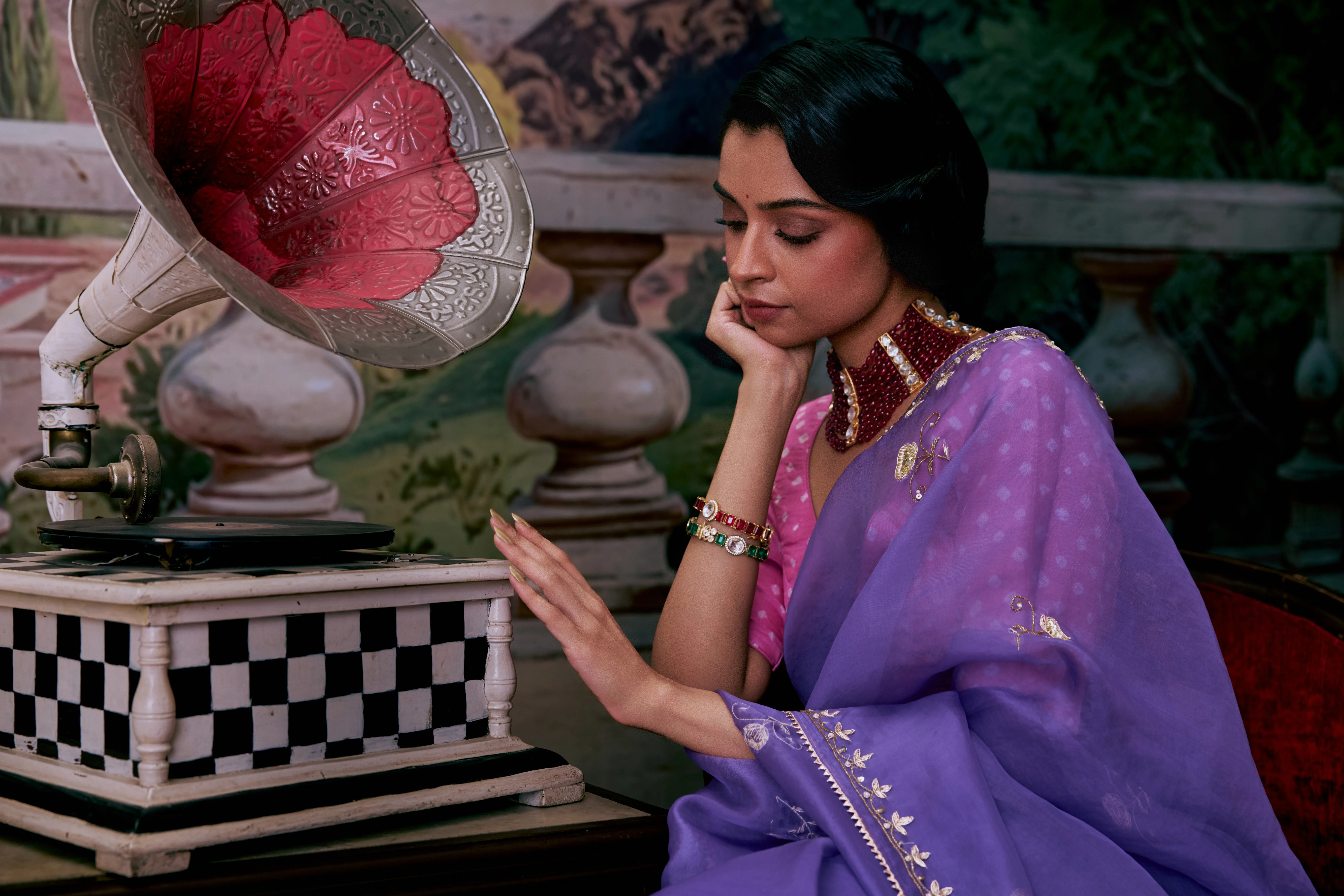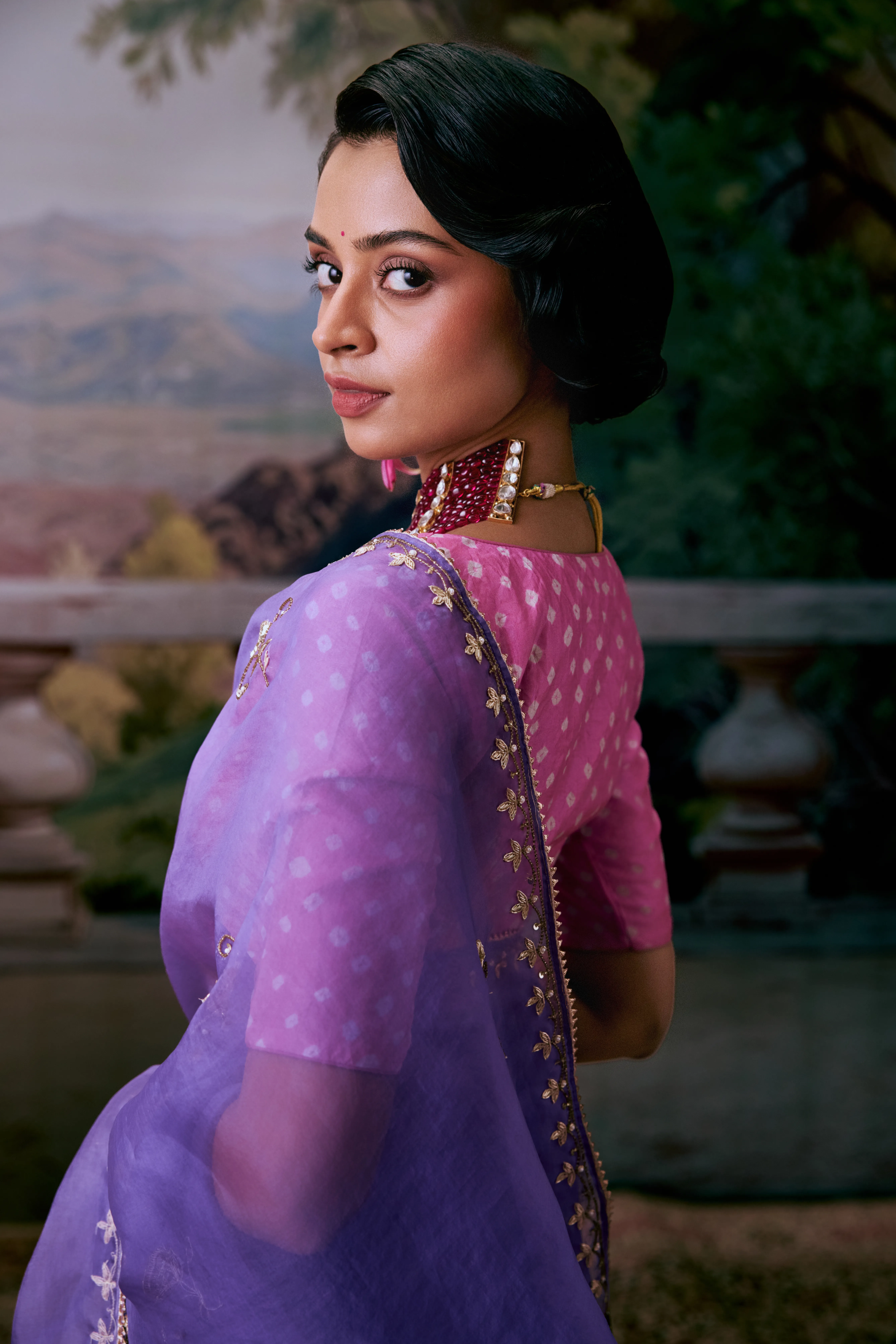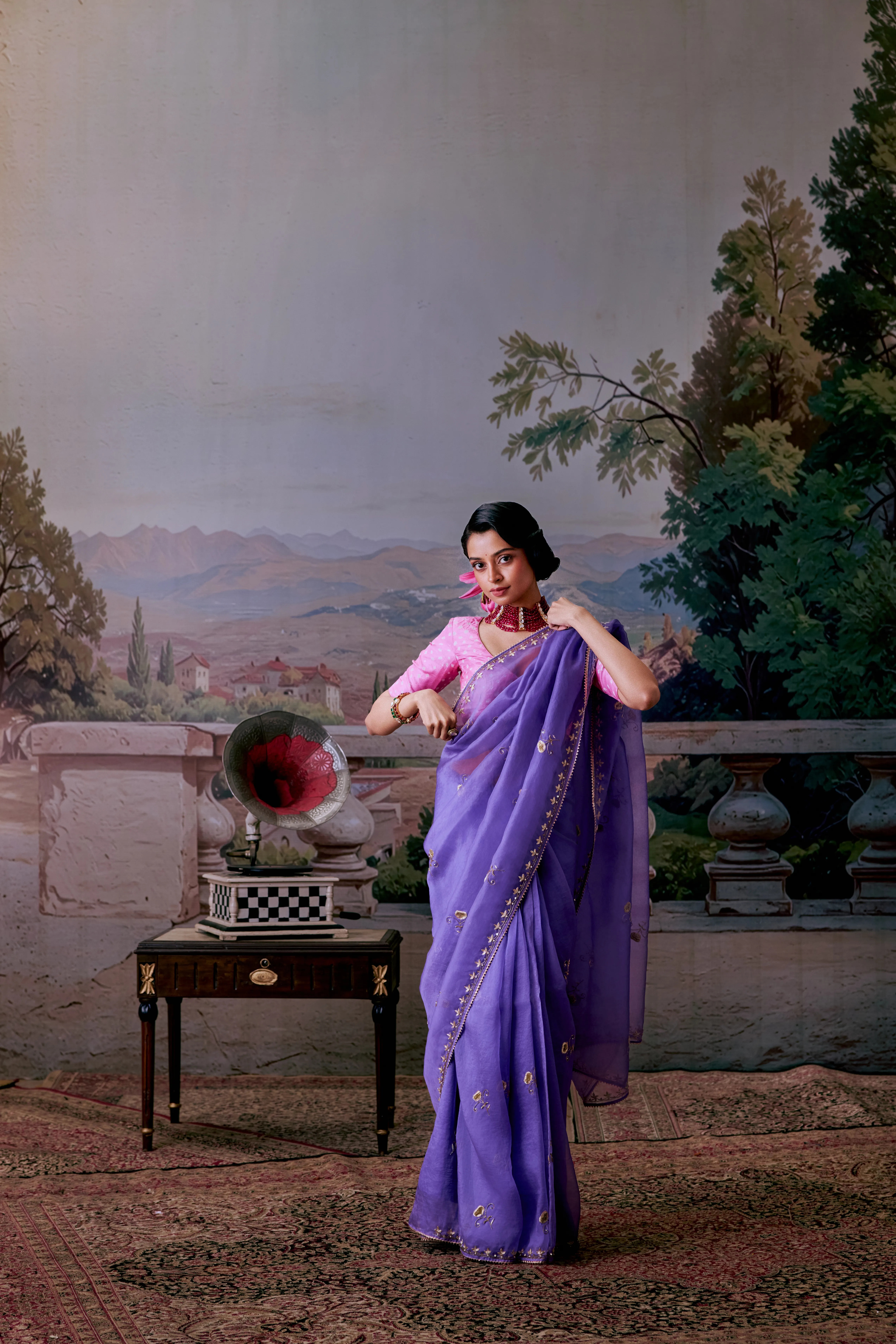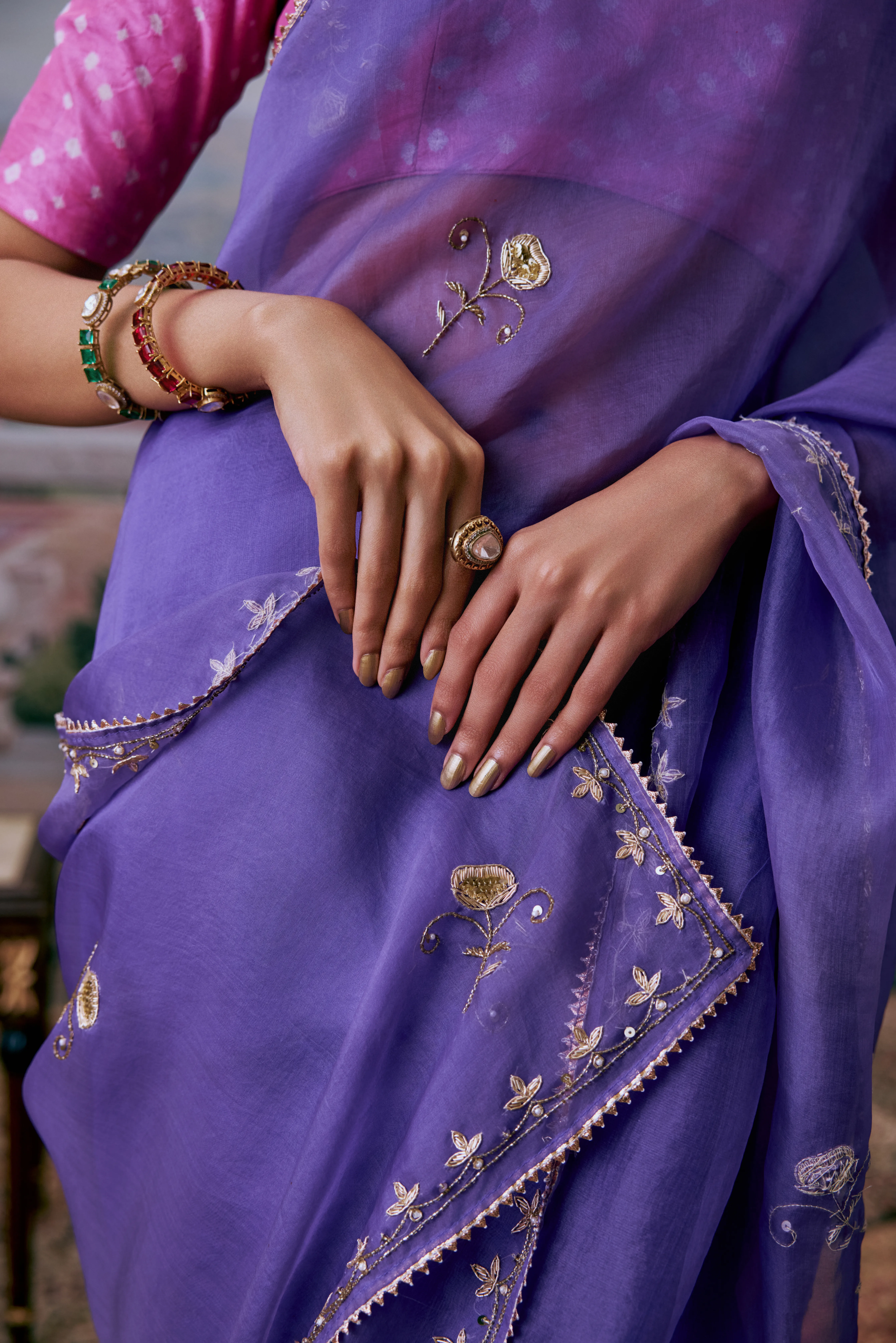 A stunning lavender organza saree adorned with intricate Aari and Zardosi work, can be paired beautifully with a vibrant pink bandhani blouse.