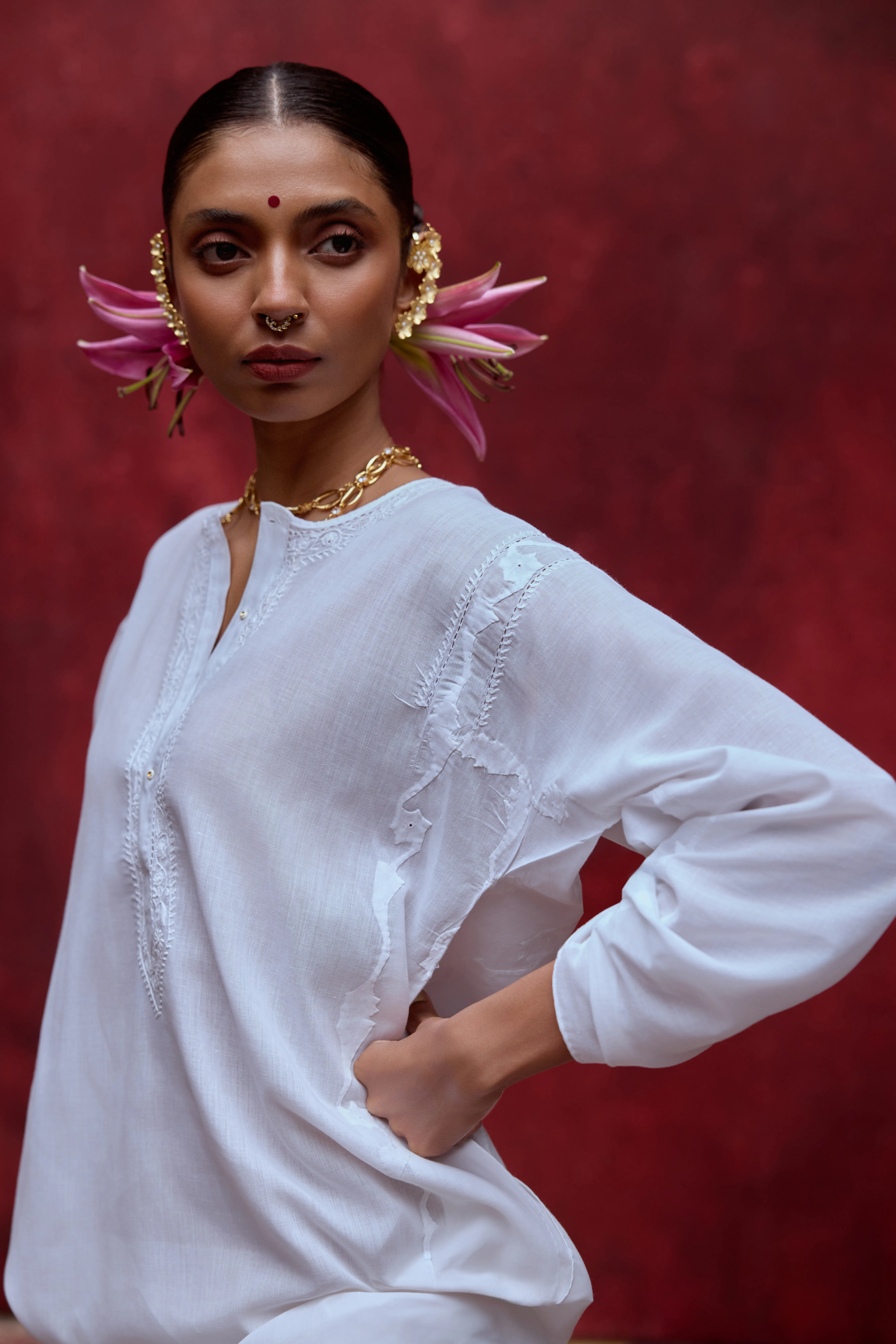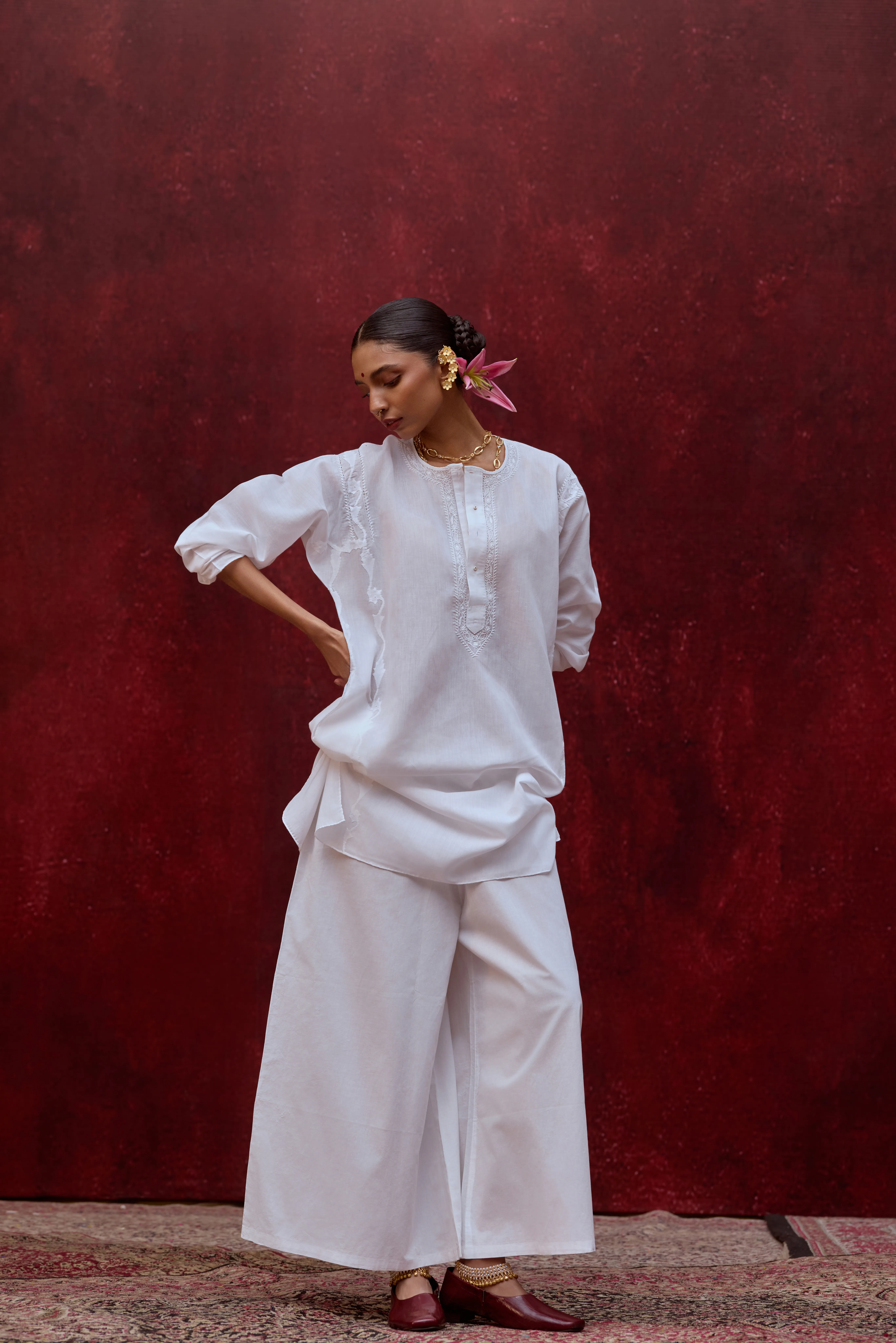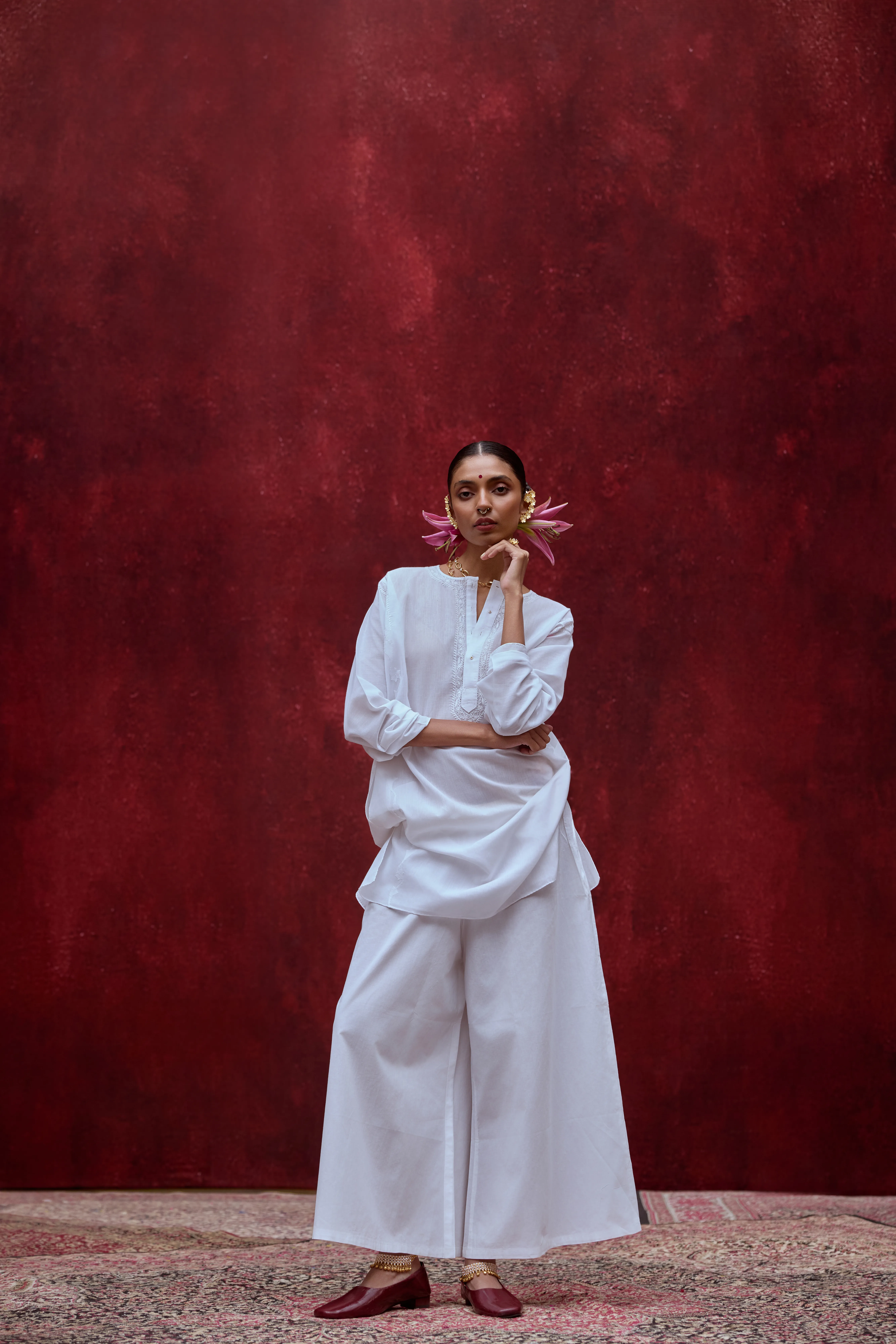 A breezy cotton co-ord set featuring a short kurti adorned with fine chikankari work, paired with a comfortable pure cotton palazzo. Designed in a timeless white hue, this ensemble blends delicate craftsmanship with effortless everyday elegance and breathable comfort.