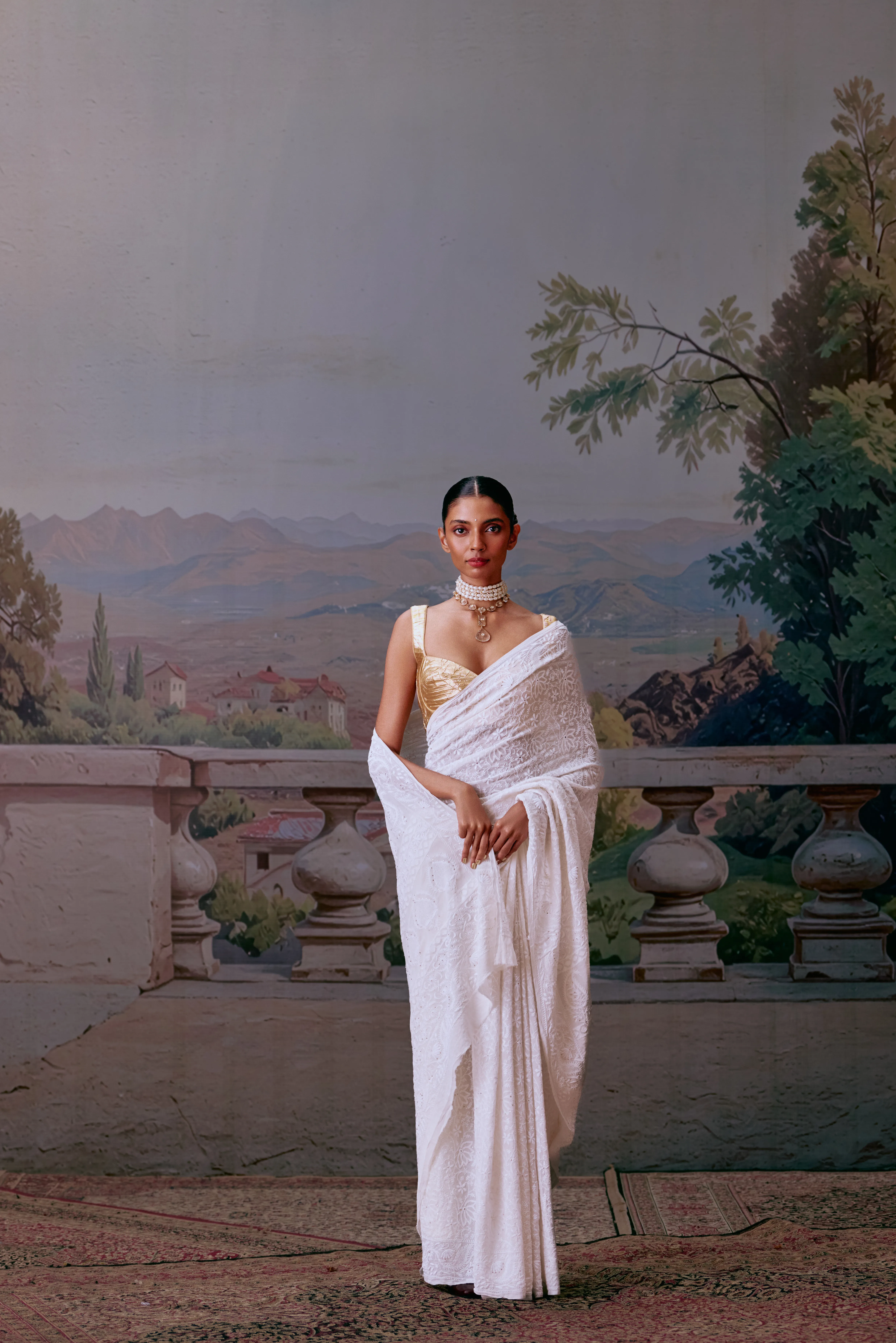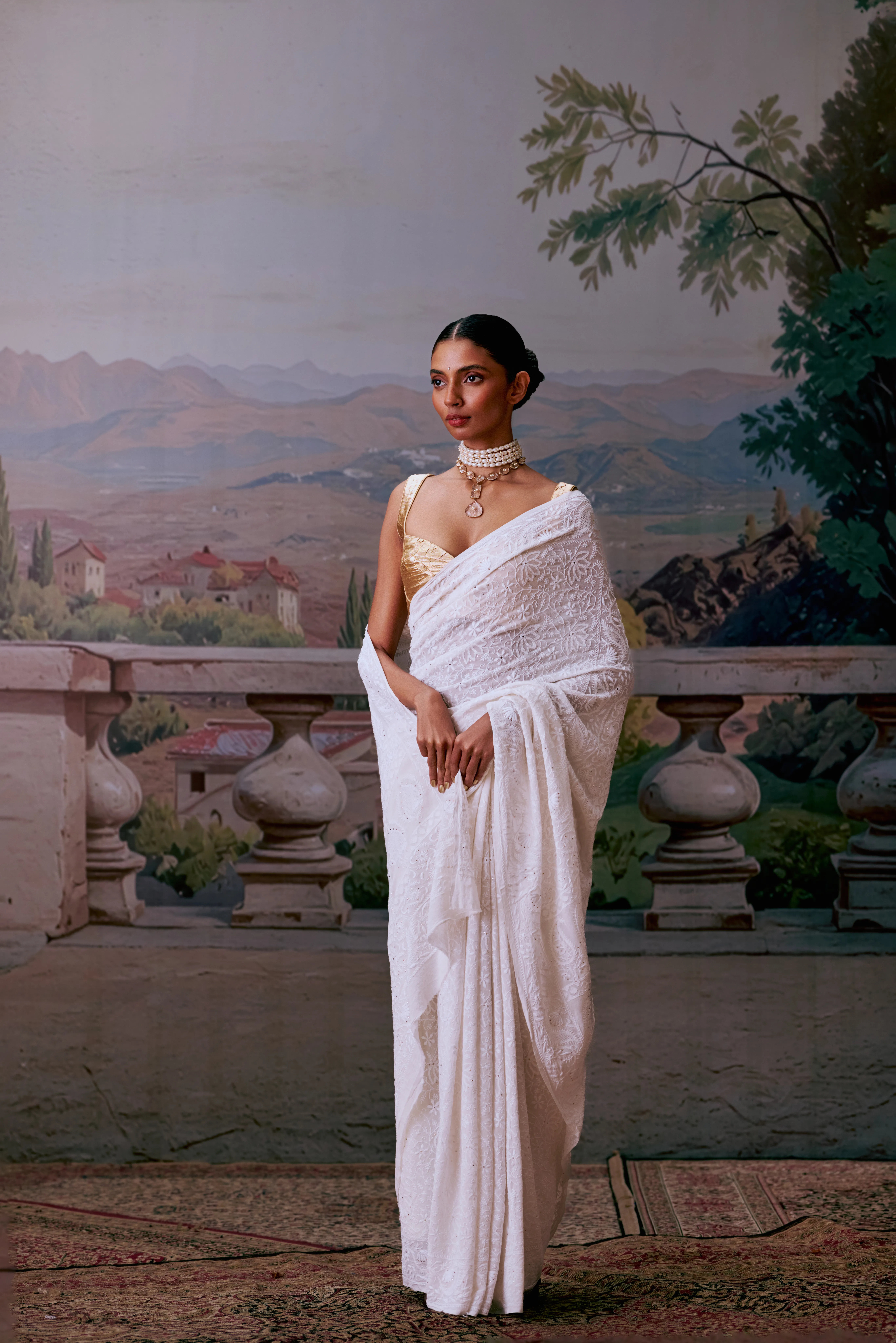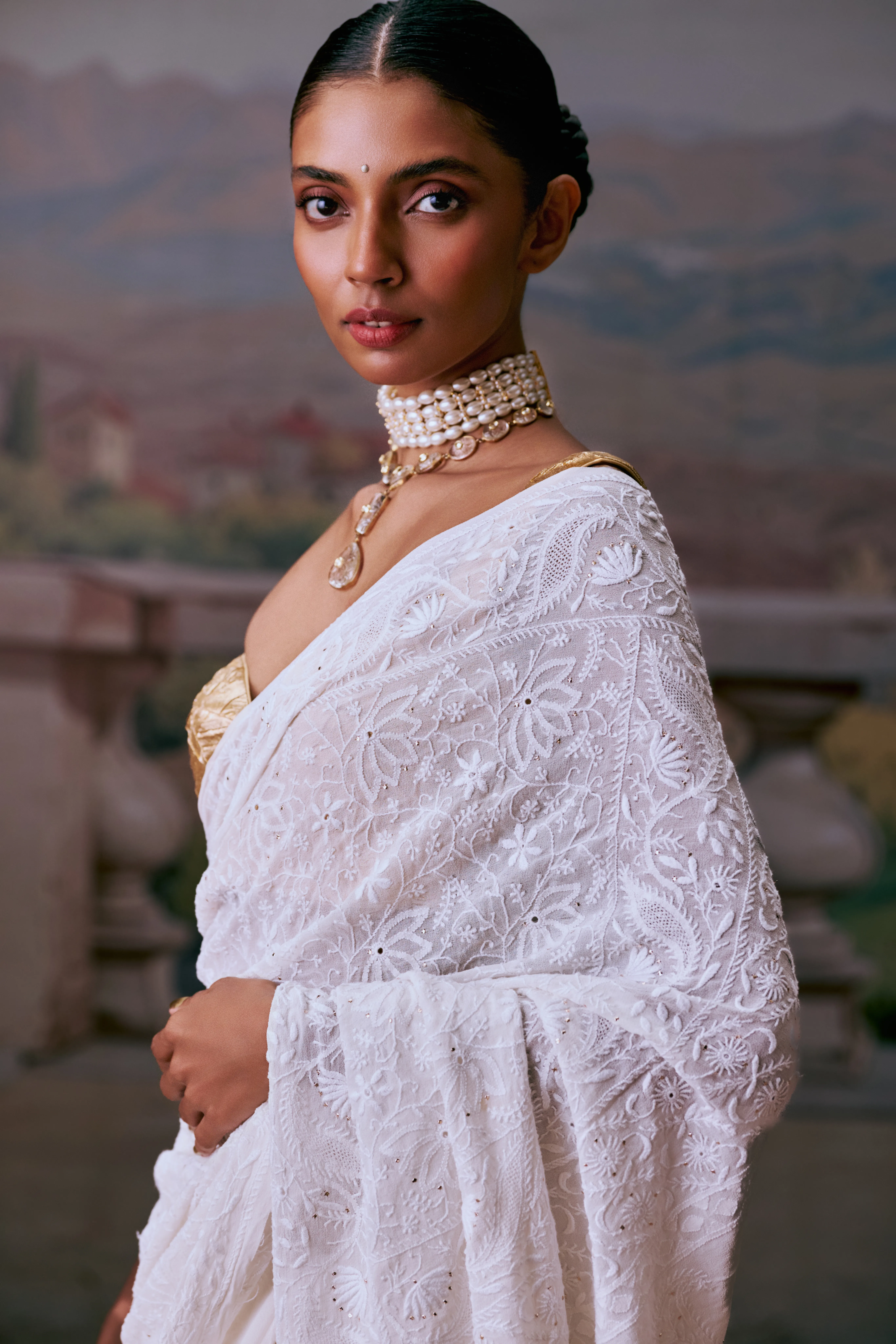 A graceful white georgette saree adorned with fine Chikankari and delicate Mukesh work, creating a soft, luminous elegance.