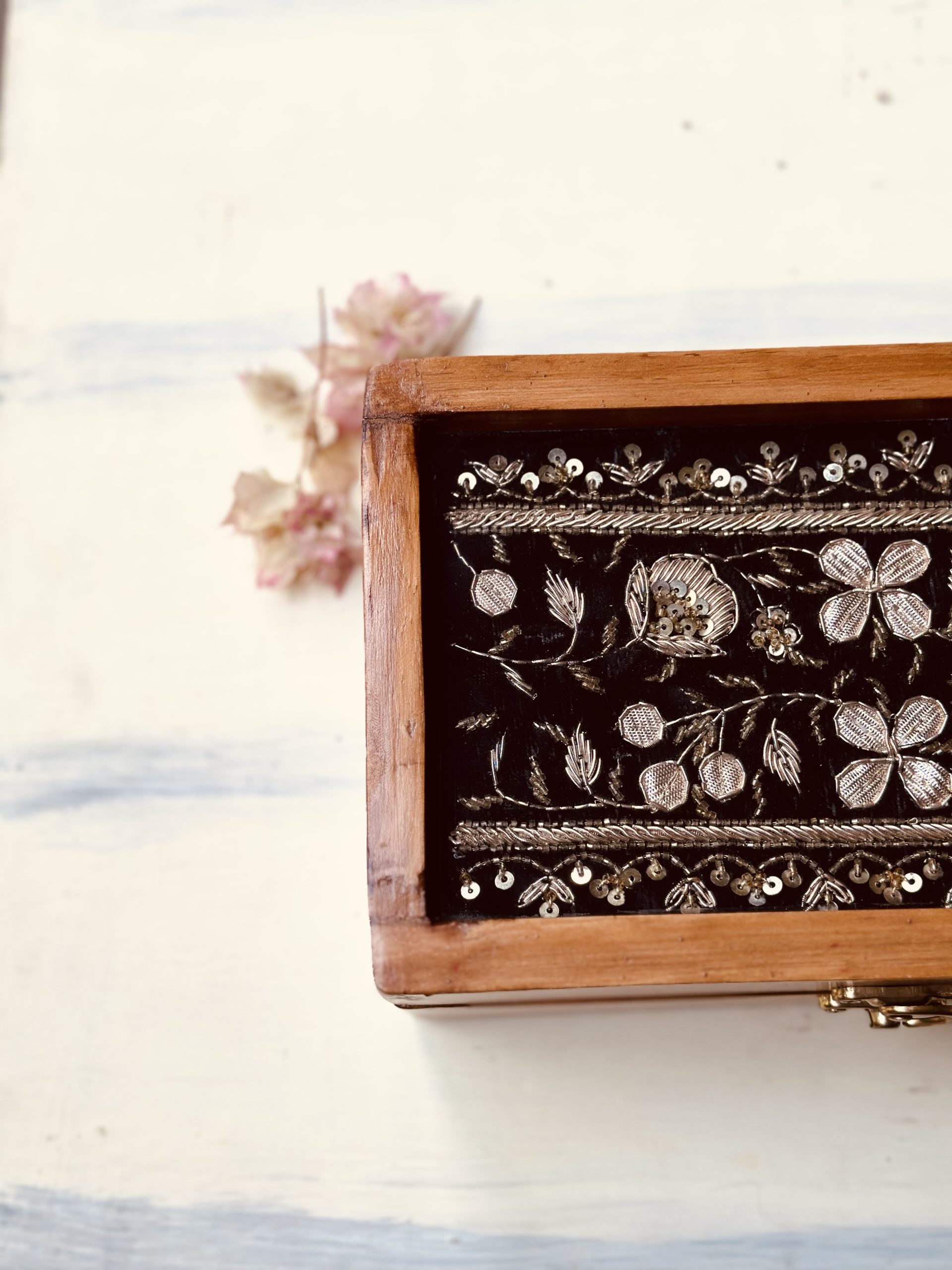 These beautiful one taar aari zardozi pinewood proper glass cases are passionately made by Tawaq and Imran on pure velvet then framed into a box by Tewari and Sumit and then polished to perfection by Brahmanand and Shaban. It’s perfect for keeping your jewellery or your priceless memories.