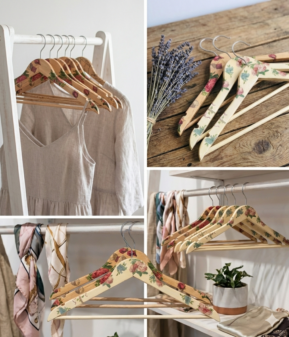 Each hanger is carefully handcrafted from sturdy wood and adorned with exquisite decoupage artwork, sealed with a protective finish for durability. The smooth, lightweight design prevents fabric snags, while the curved shape maintains the form of your garments. Perfect for hanging delicate fabrics, coats, or everyday wear, these hangers bring a stylish and artistic flair to your closet. A charming blend of functionality and craftsmanship, they make a unique gift or a lovely addition to your home.