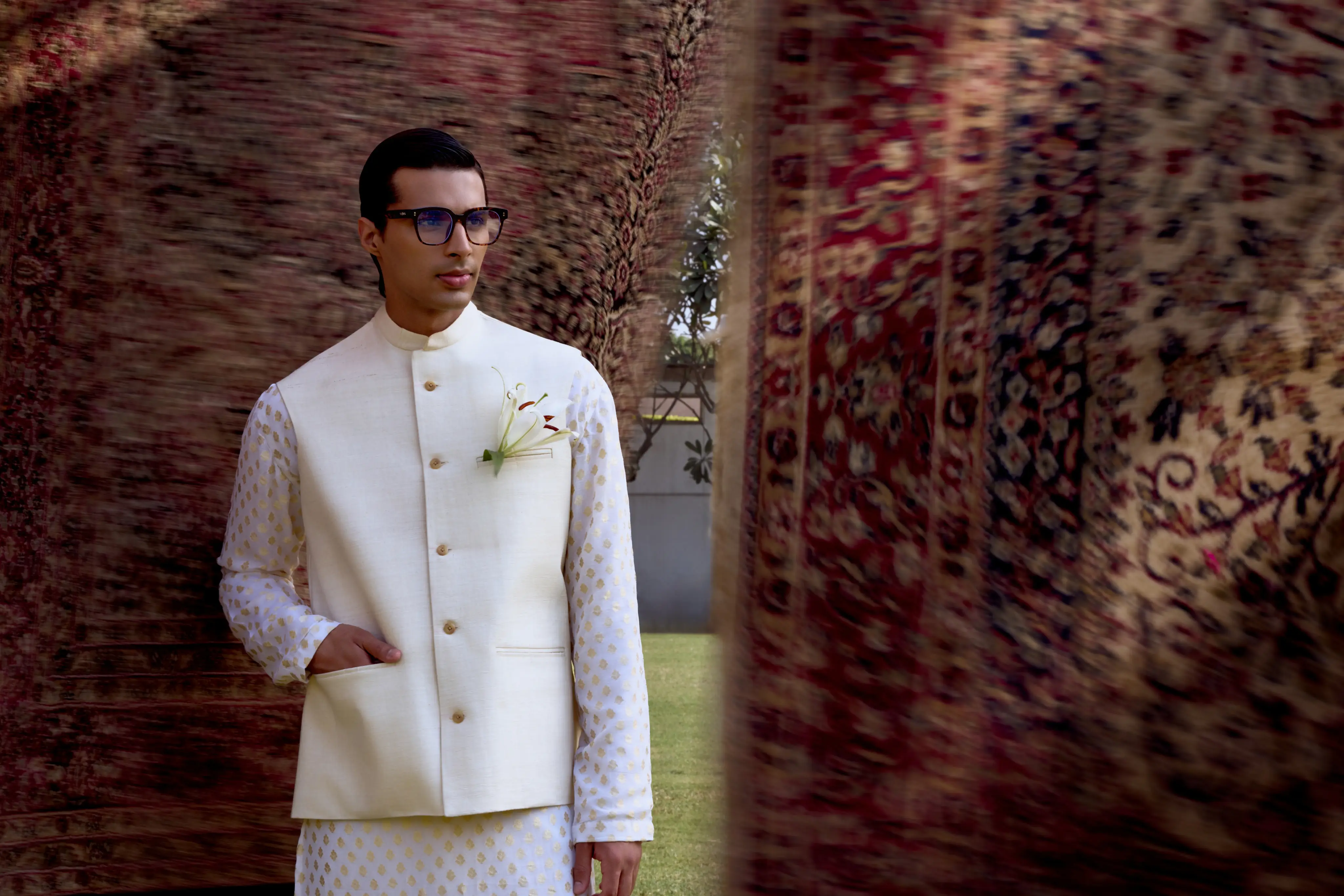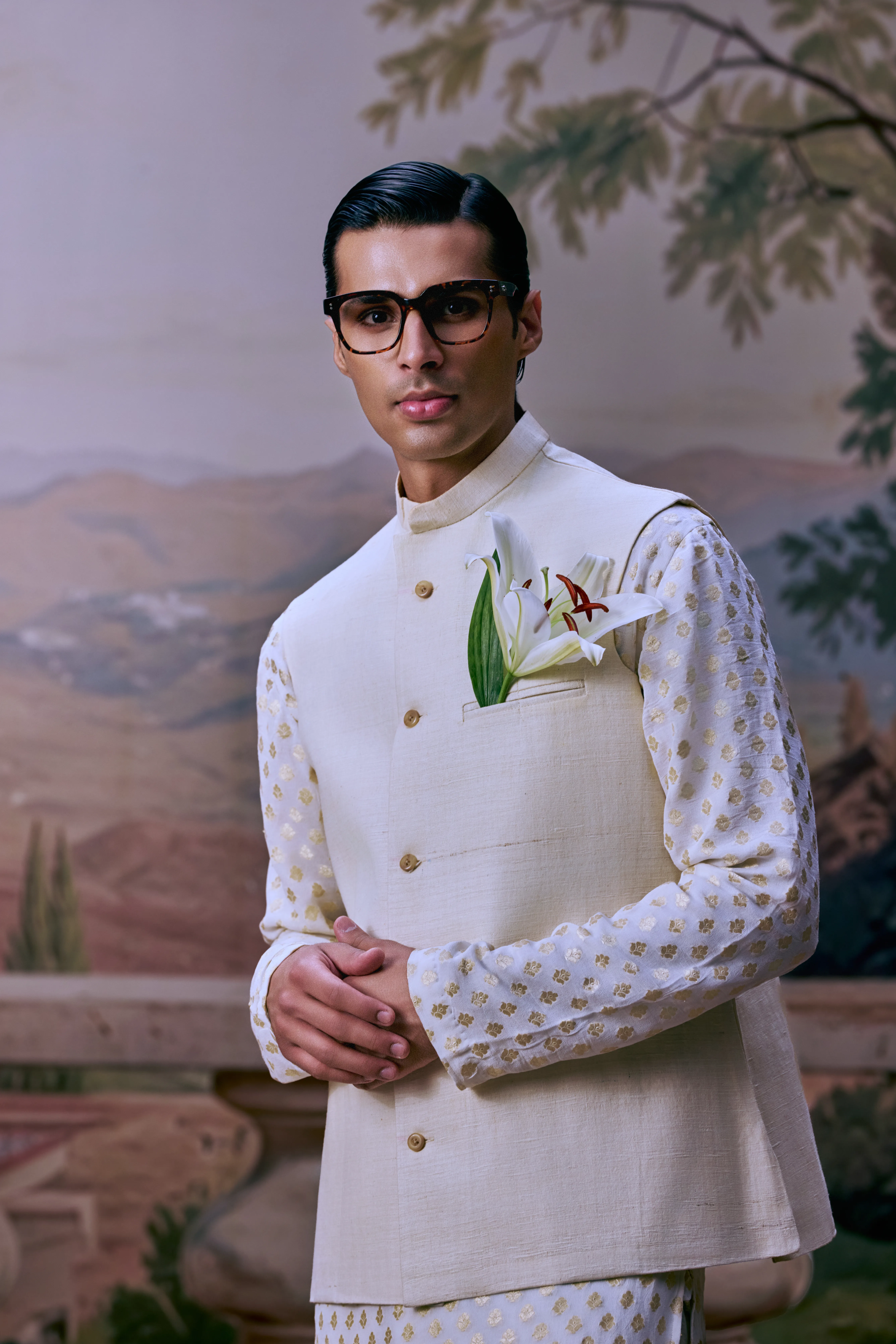 A classic white khadi sadri for men, tailored in size 42 with a clean, structured silhouette and three functional pockets paired with a 6 meter Mul Chanderi plain Dhoti.