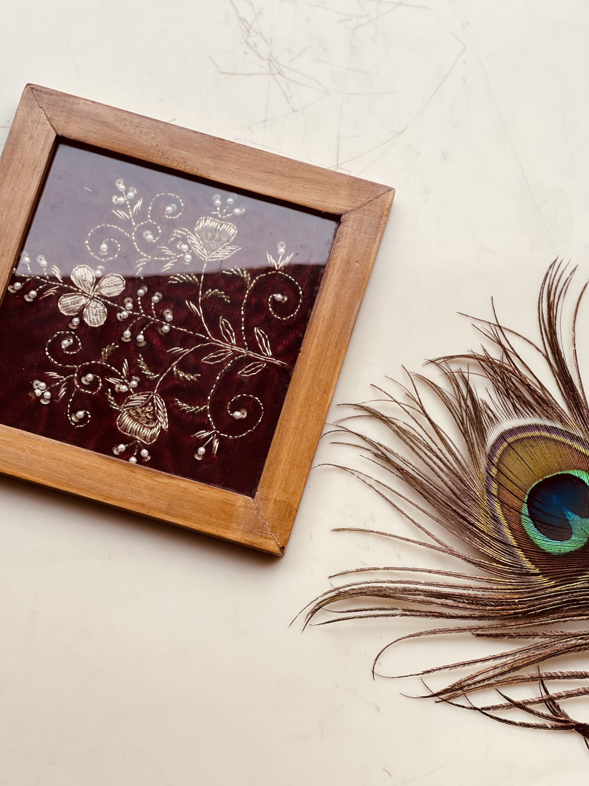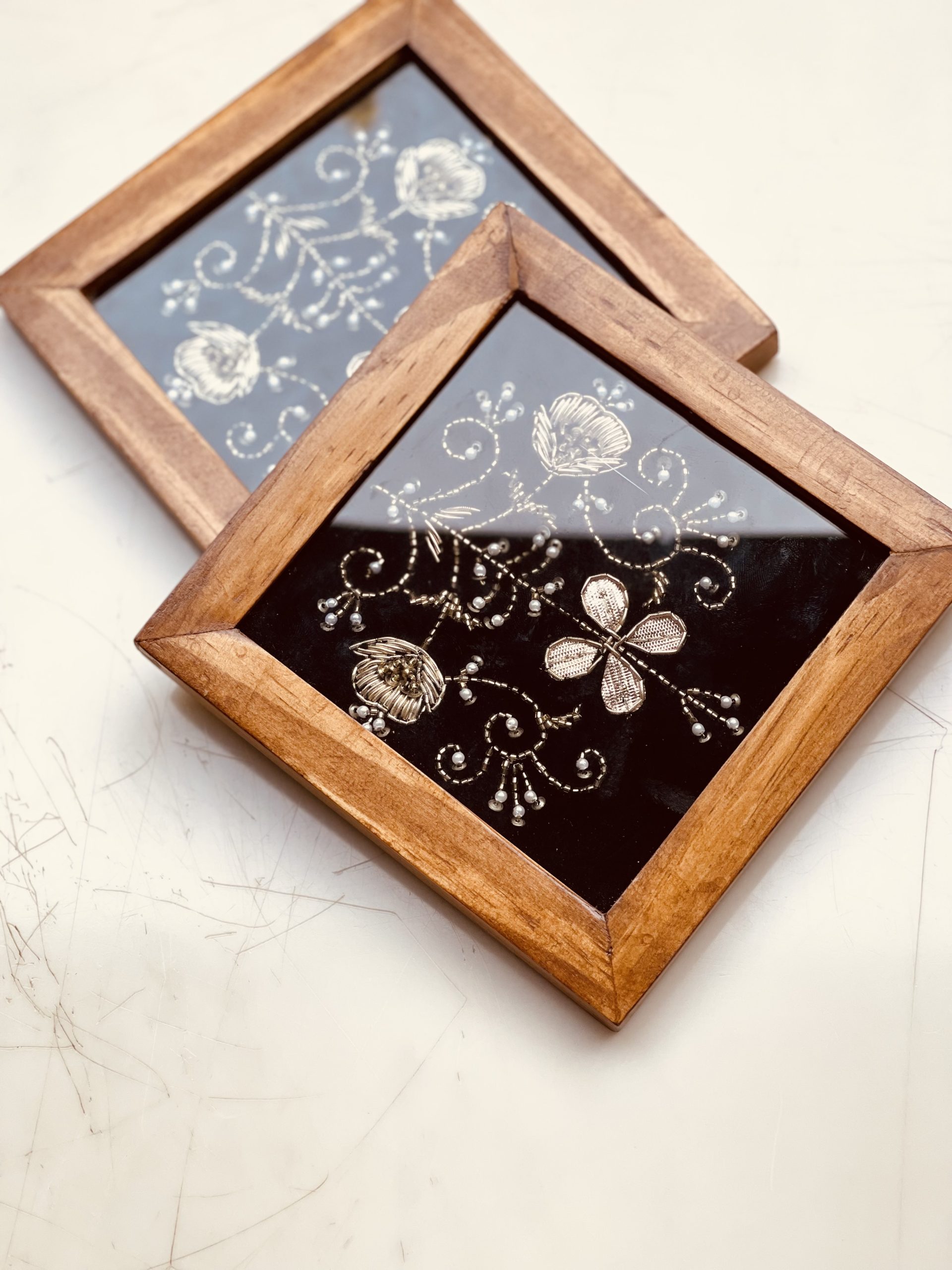 Aari zardozi works are one of the traditonal crafts of lucknow, you will find these craftman majorily in the lanes of aminabad and chowk. These beautiful one taar zardozi pinewood, fine velvet coasters are passionately made by Shaan and Tawaq Ali ,meticulously framed by Azgar and polished by Shaban and Tewari. These fine pieces takes a lot of time , experience and handwork of years to bring them to live and adorn our tables.