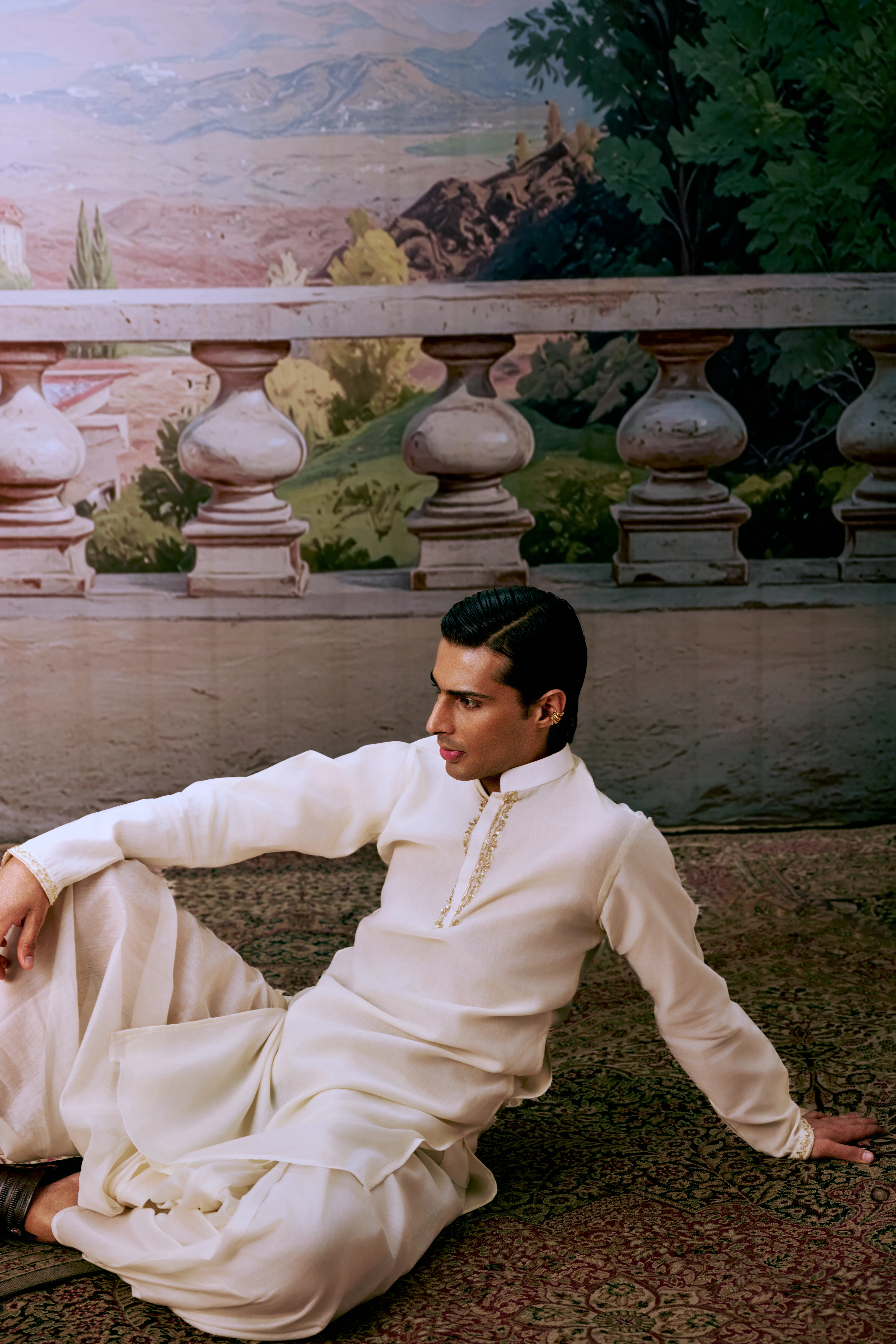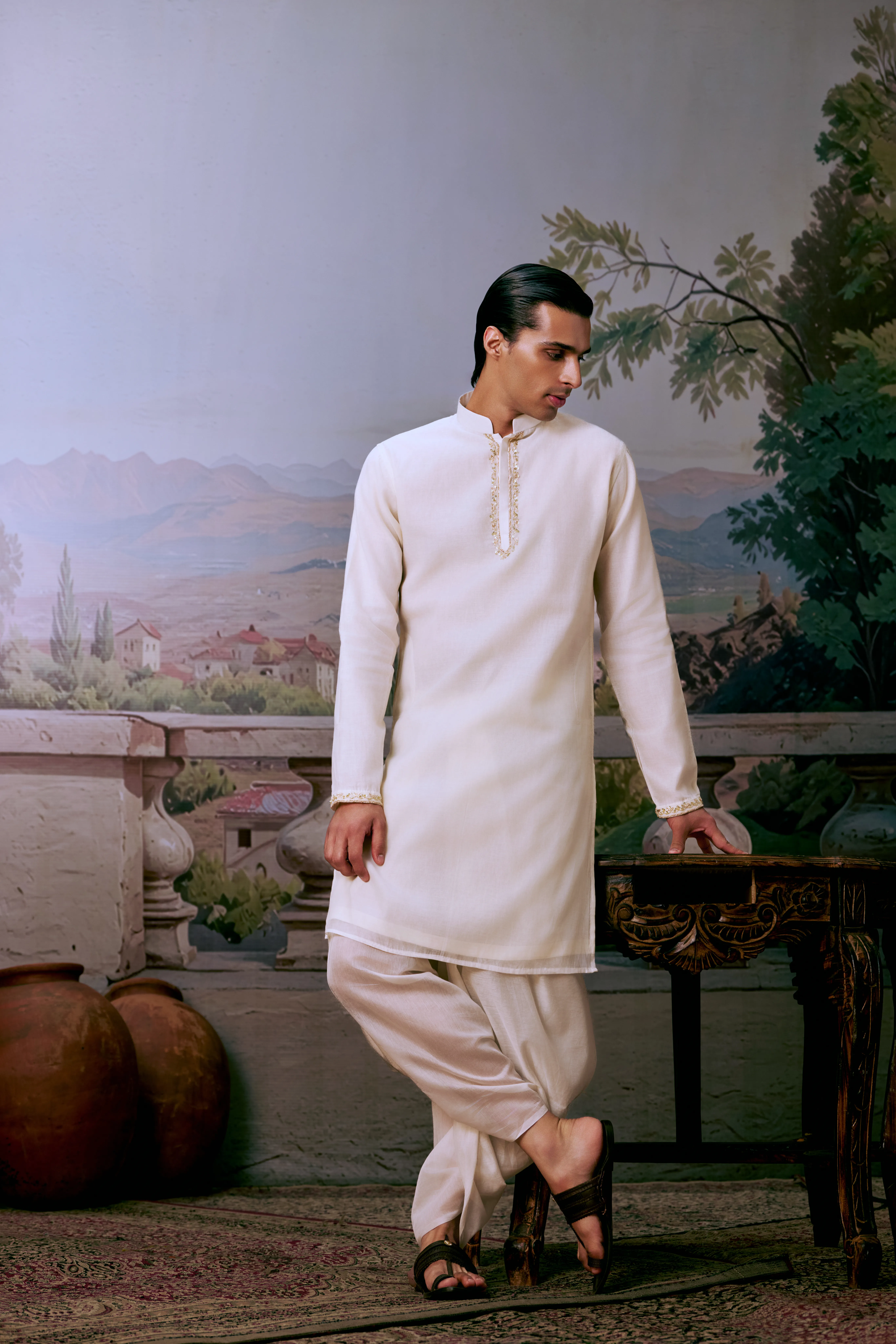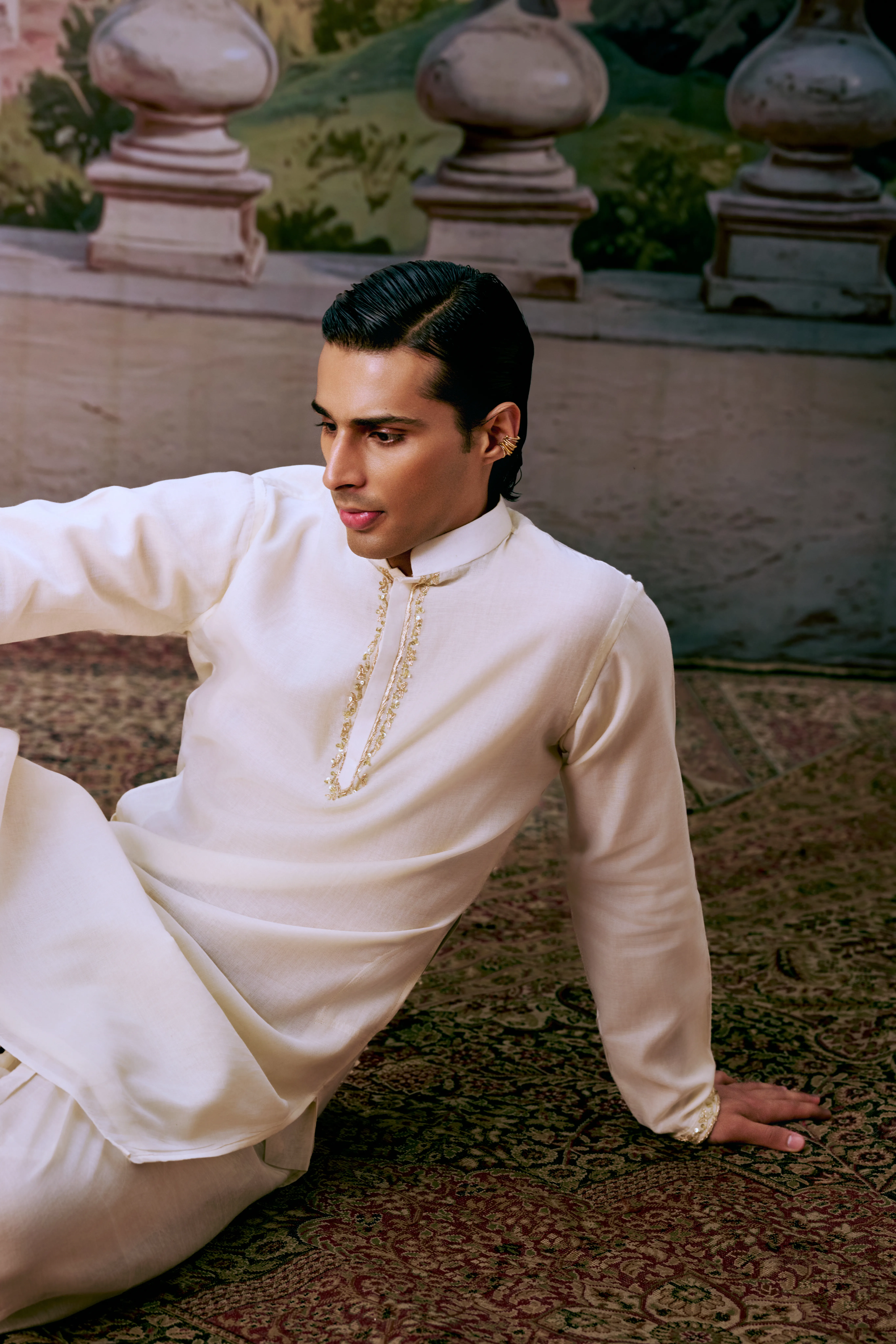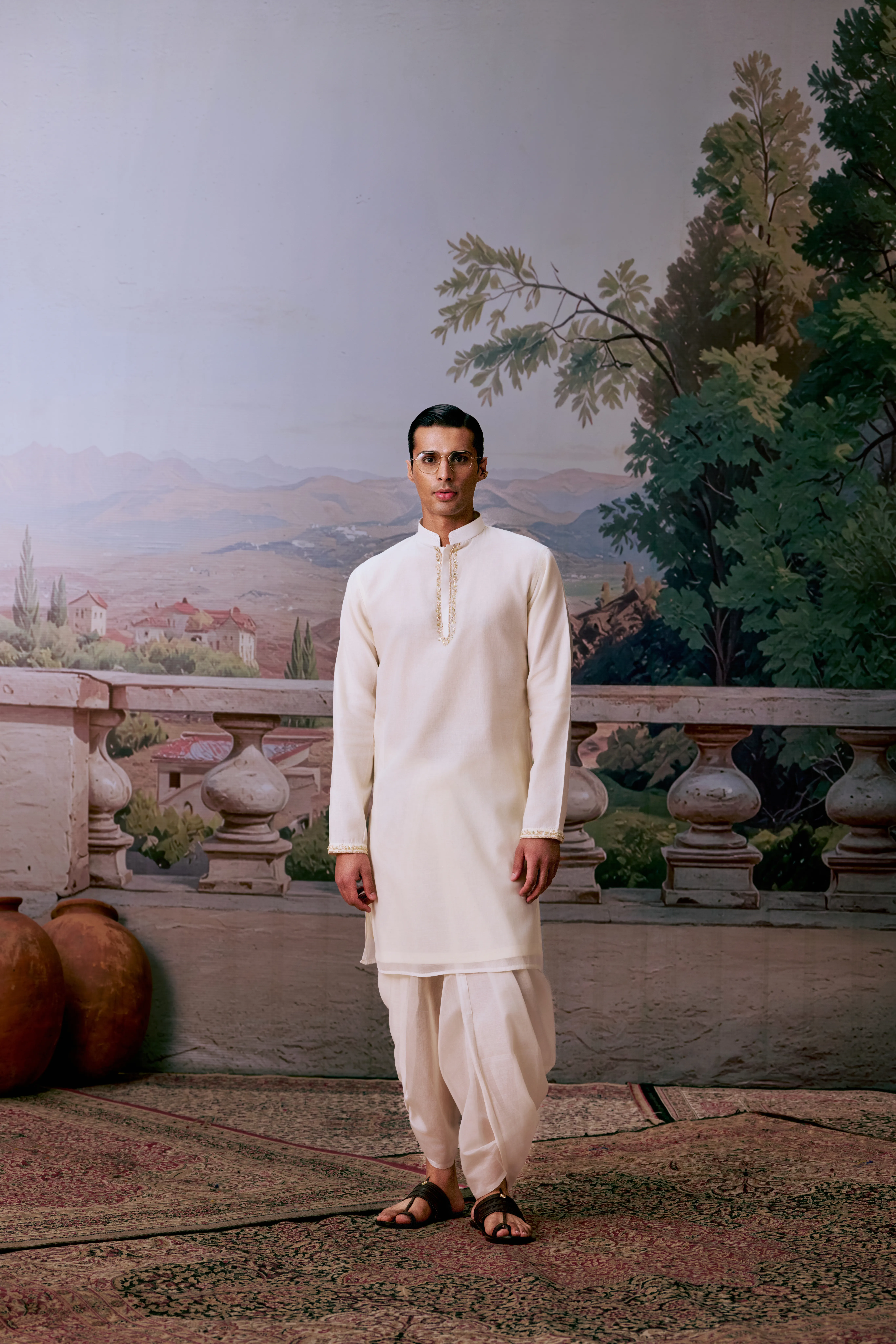 A refined cream Mul Chanderi kurta for men, adorned with intricate Aari and Zardozi work for a rich traditional appeal.
