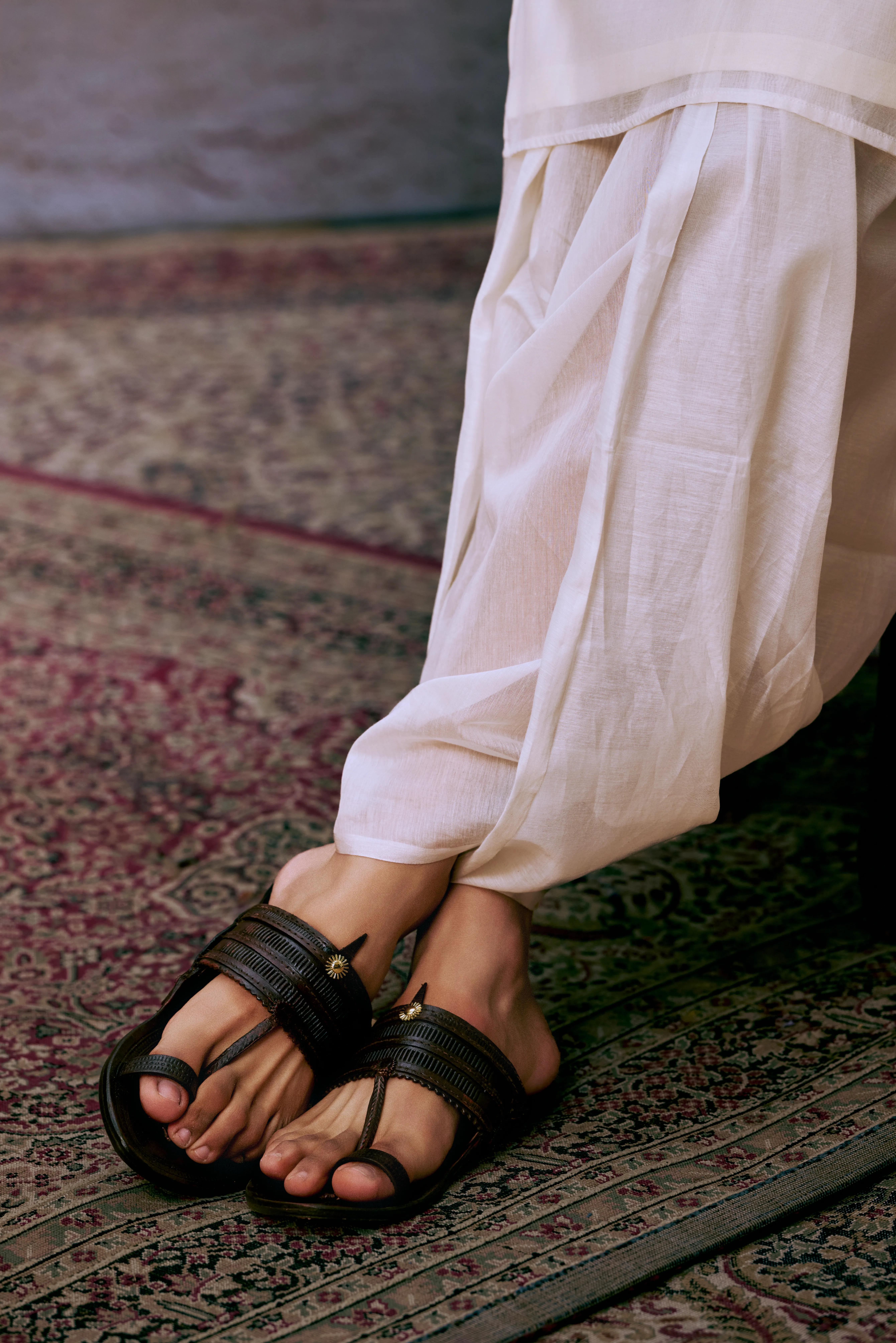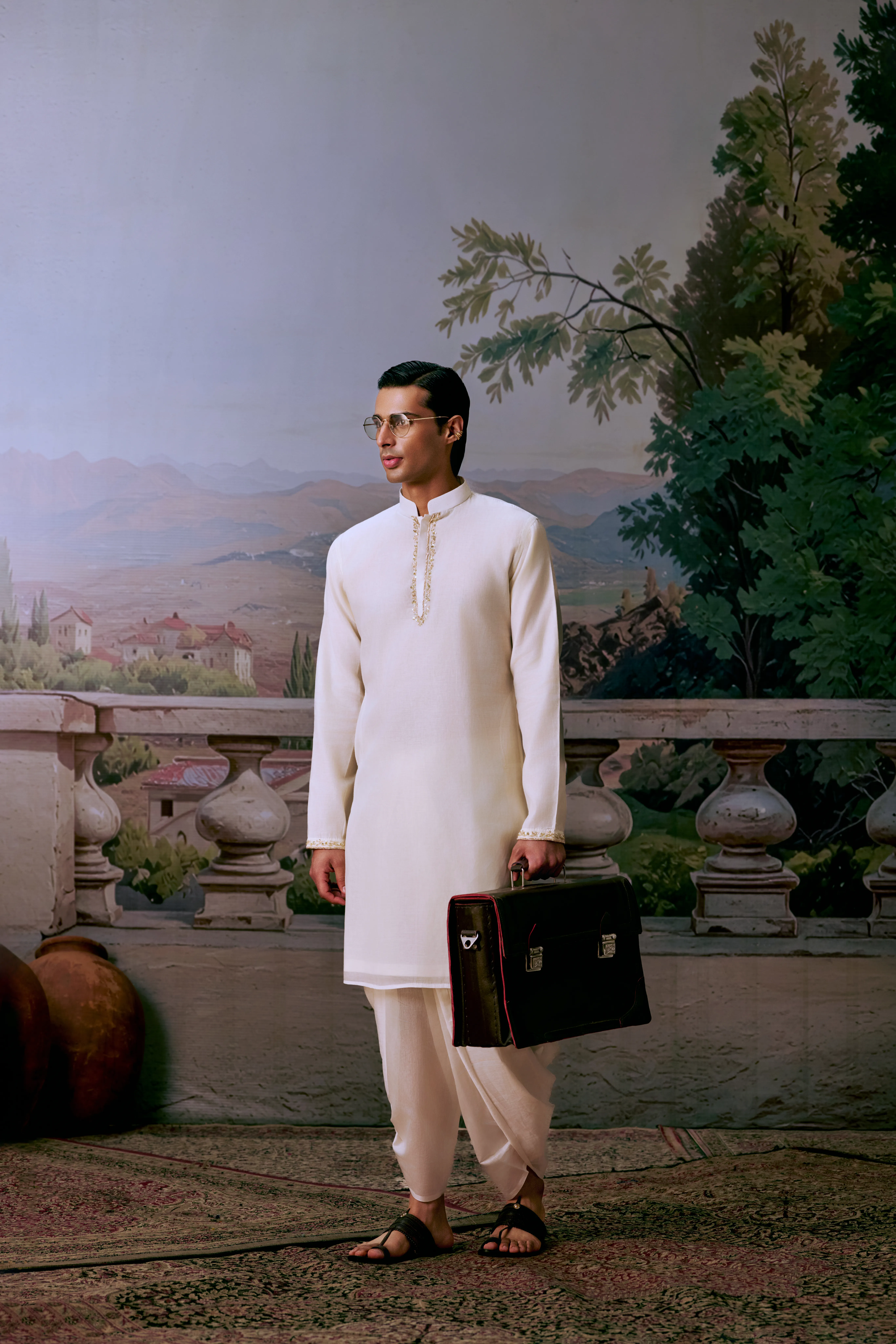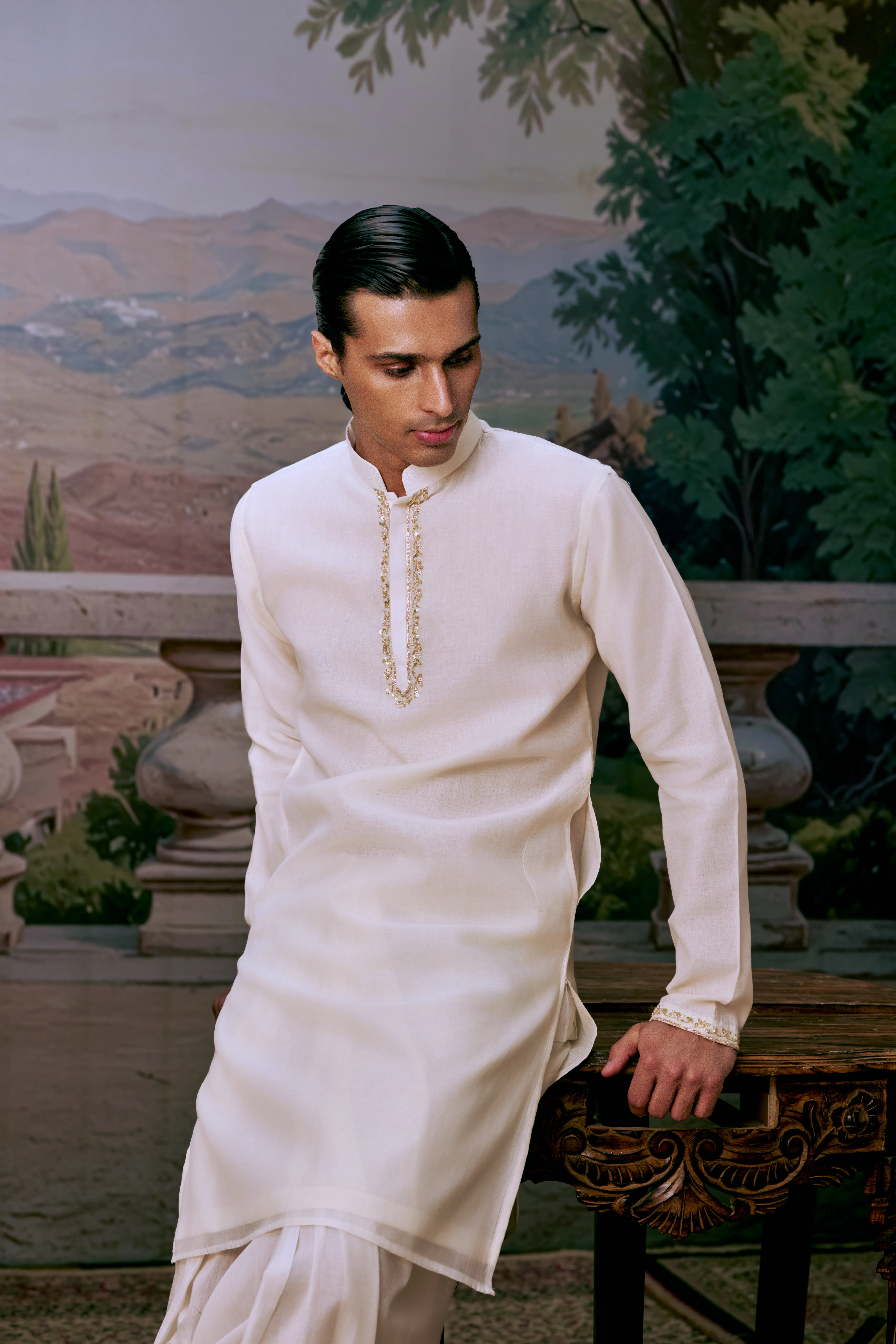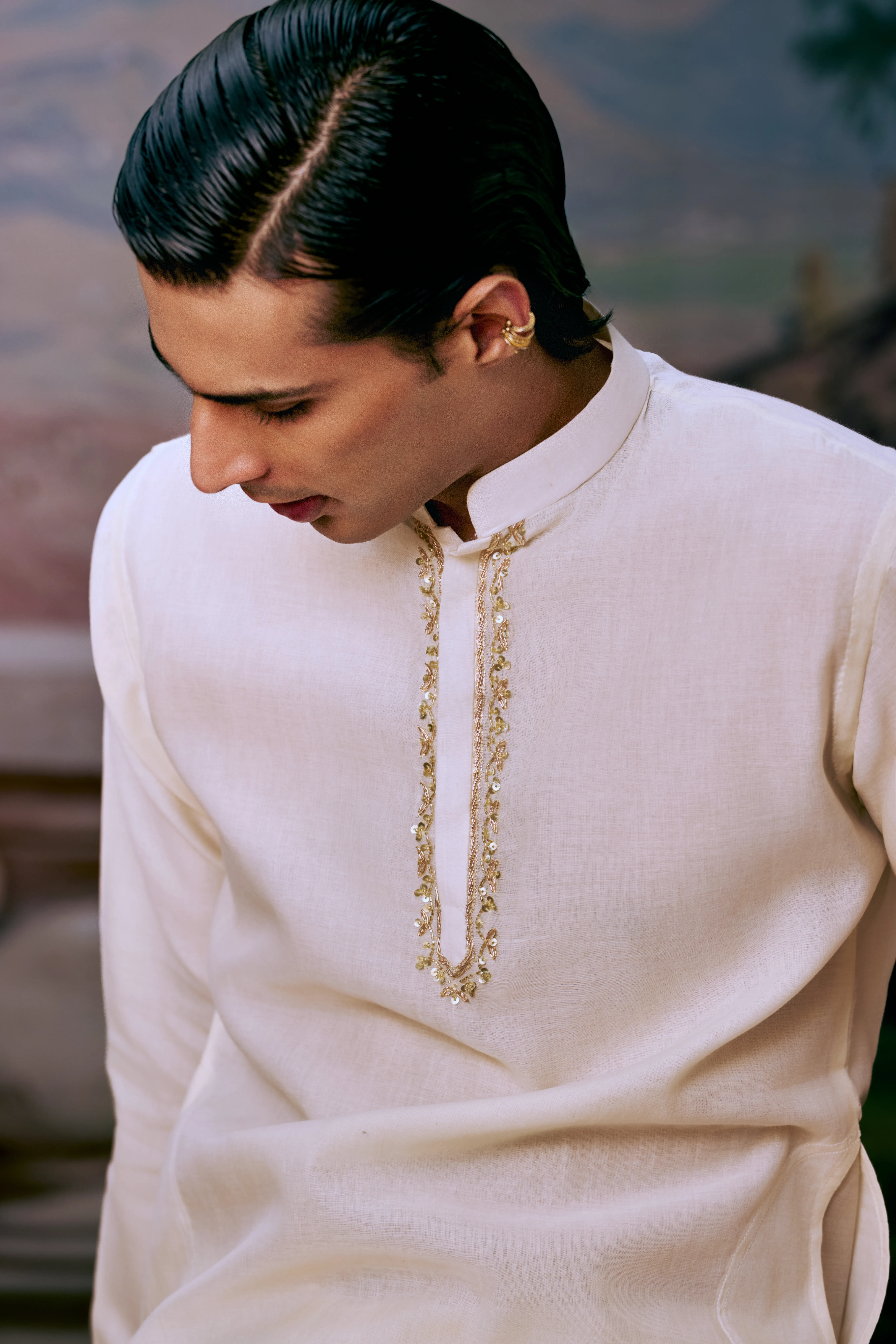 A refined cream Mul Chanderi kurta for men, adorned with intricate Aari and Zardozi work for a rich traditional appeal.