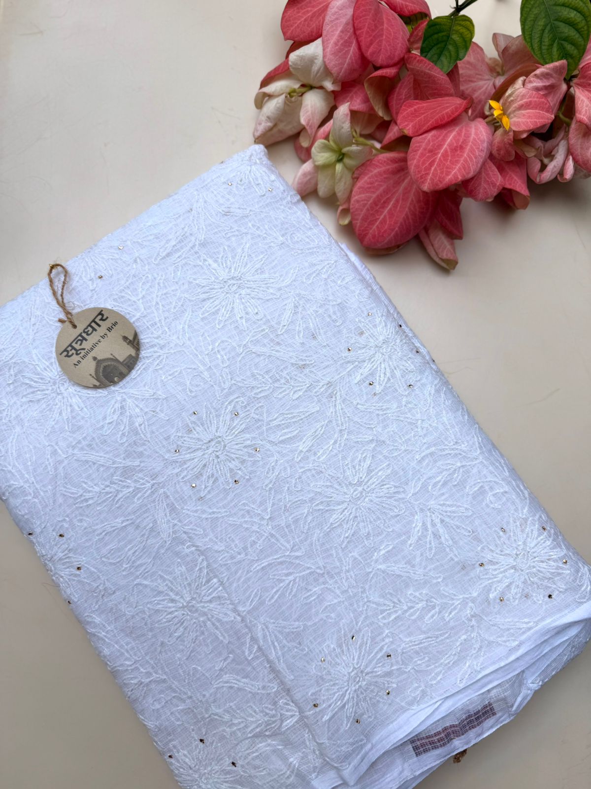 A delicate blend of elegance and heritage, this saree features the finesse of Tepchi embroidery paired with intricate Jaali work, creating a soft, translucent texture across the fabric. Subtle touches of light Mukesh embellishments shimmer gracefully, adding just the right amount of festive charm. Crafted by skilled artisans, this saree celebrates the understated beauty of hand embroidery—perfect for those who appreciate timeless grace with a modern soul. Ideal for day events, intimate gatherings, or cultural celebrations.